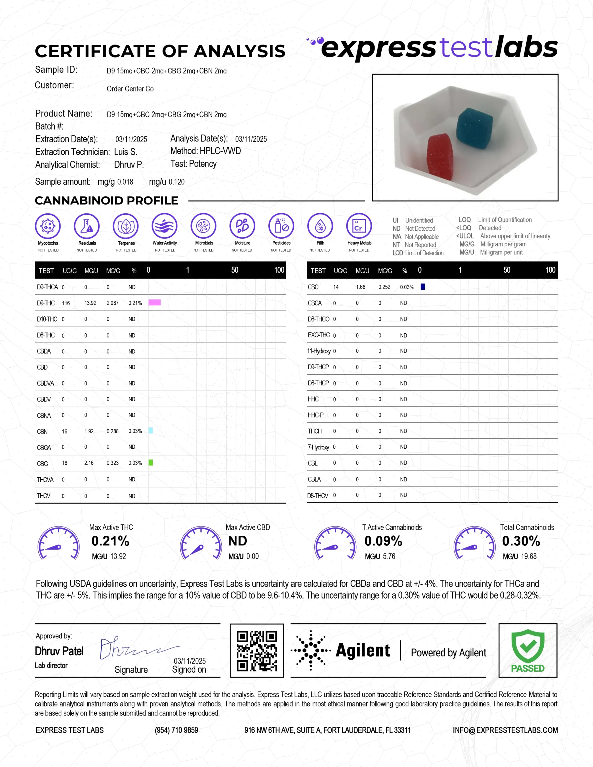 All of your gummies undergo third-party lab testing to ensure purity, quality, and accurate dosing. You can enjoy your gummies with the peace of mind that you're eating exactly what you paid for: high-quality, pure, accurately-dosed cannabinoids.