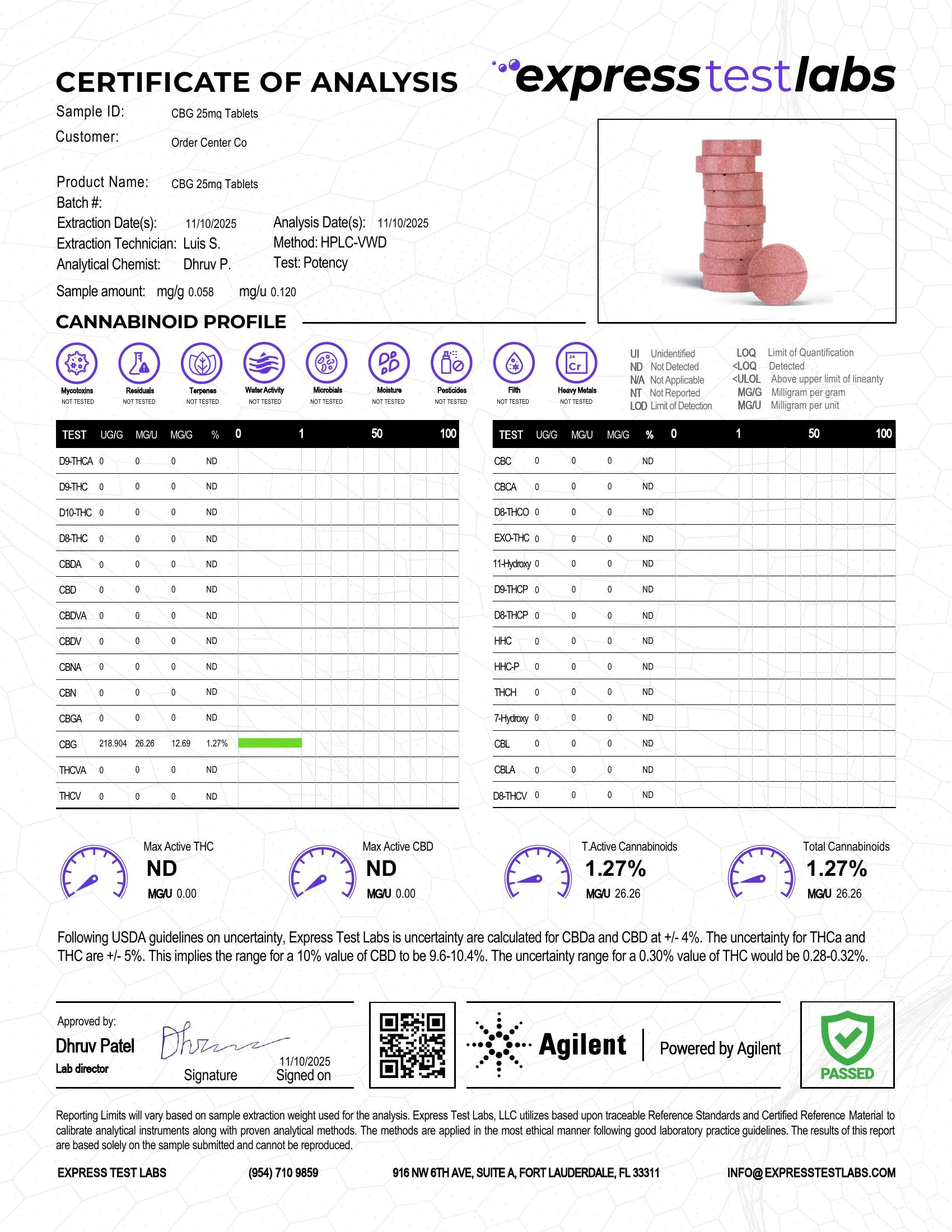 - Each tablet contains 25mg of CBG, offering clear-headed balance and calm focus to keep you collected and on task.