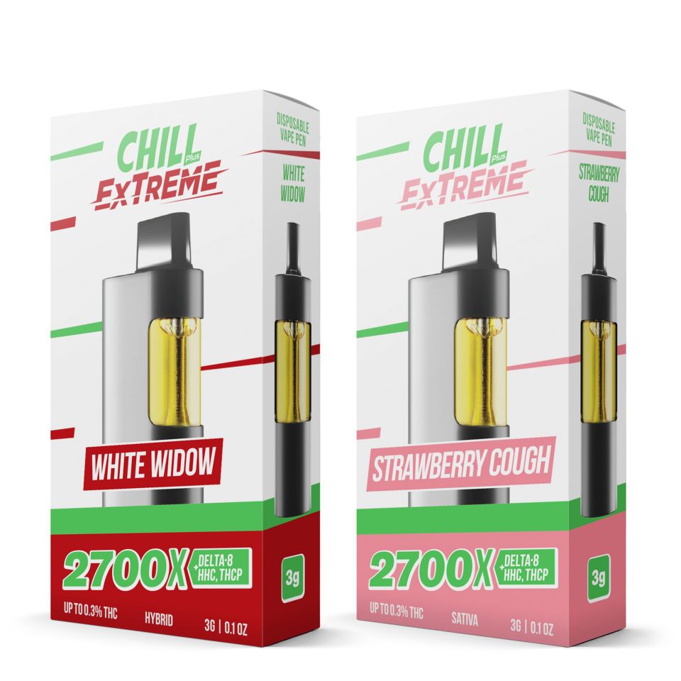 2700mg THCP, D8, HHC Vape Pen - White Widow - Hybrid - 3ml - Chill Extreme: Hemp-derived THC extract (Delta-8 extract, Hexahydrocannabinol “HHC” extract, Tetrahydrocannabiphorol “THCP” extract) and Natural Terpenes.