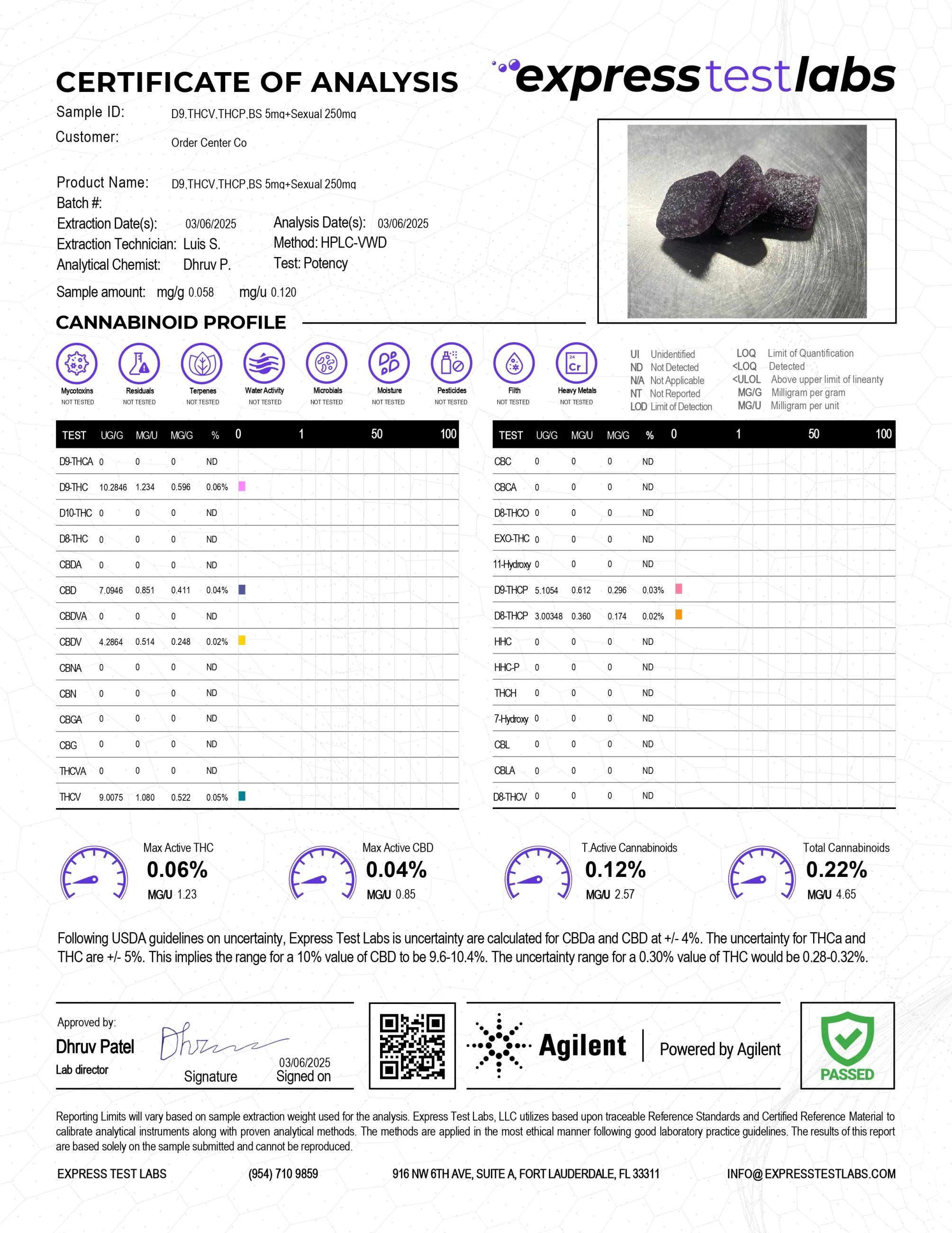 All of your gummies undergo third-party lab testing to ensure purity, quality, and accurate dosing. You can enjoy your gummies with the peace of mind that you're eating exactly what you paid for: high-quality, pure, accurately-dosed cannabinoids.