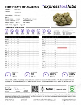 - 25.39% THCA – Cerebral, inspired, euphoric, energetic, and relaxed effects.