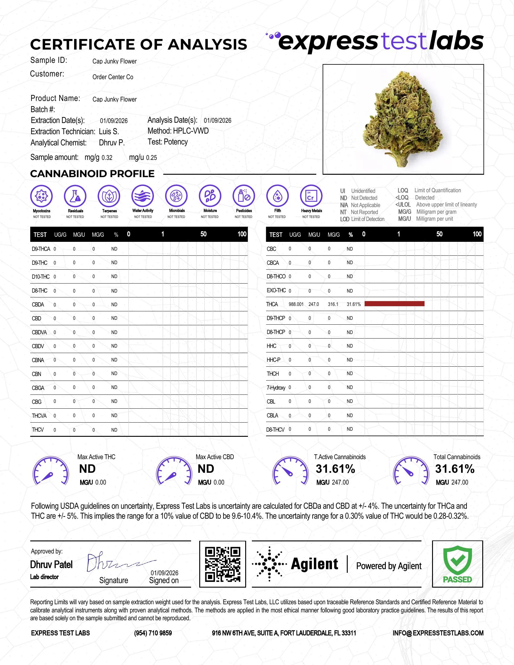 - 27.42% THCA – Providing euphoric, mentally stimulating, and relaxing effects.