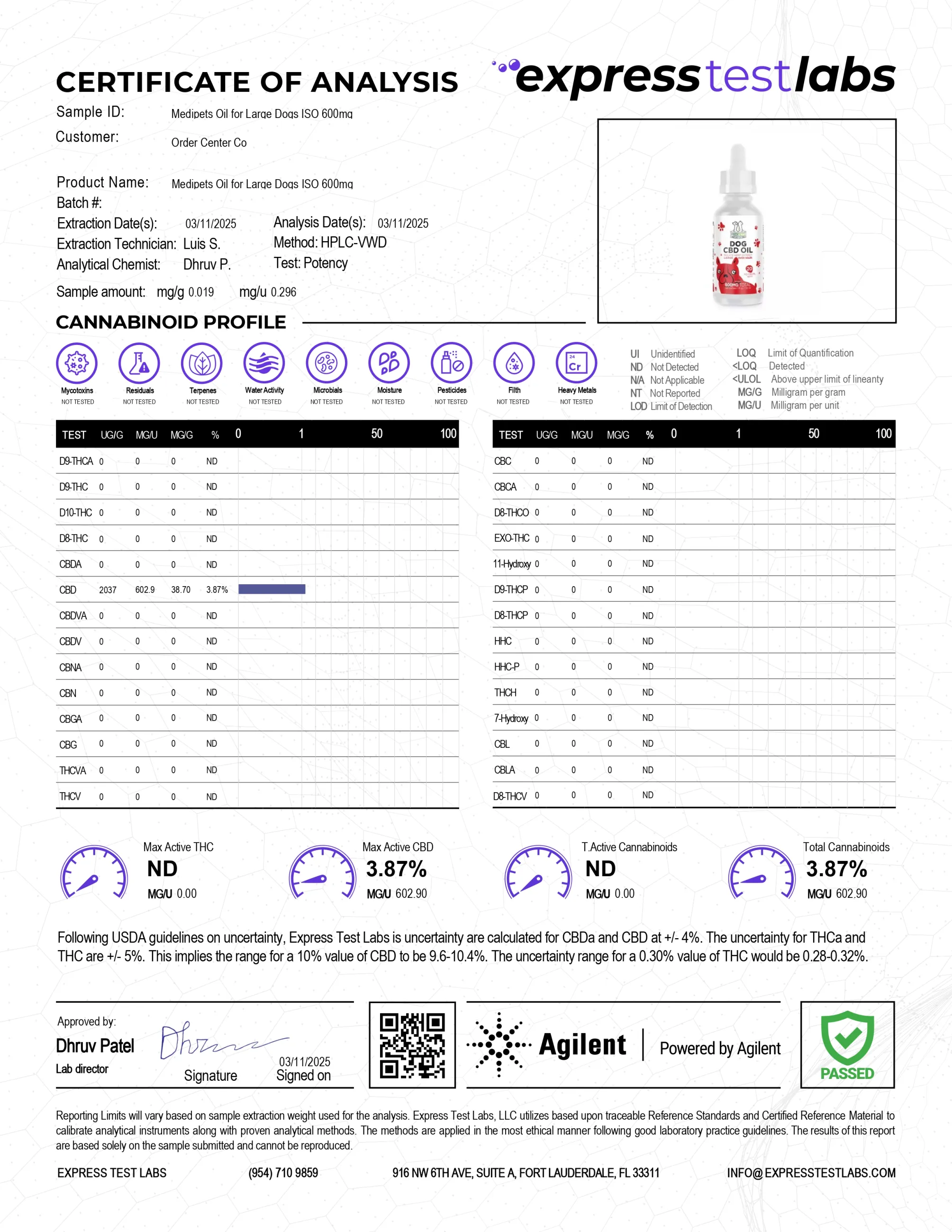 600mg CBD Pet Oils For Large Dogs - MediPets: Hemp Extract, vegetable glycerin(vg), propylene glycol(pg).