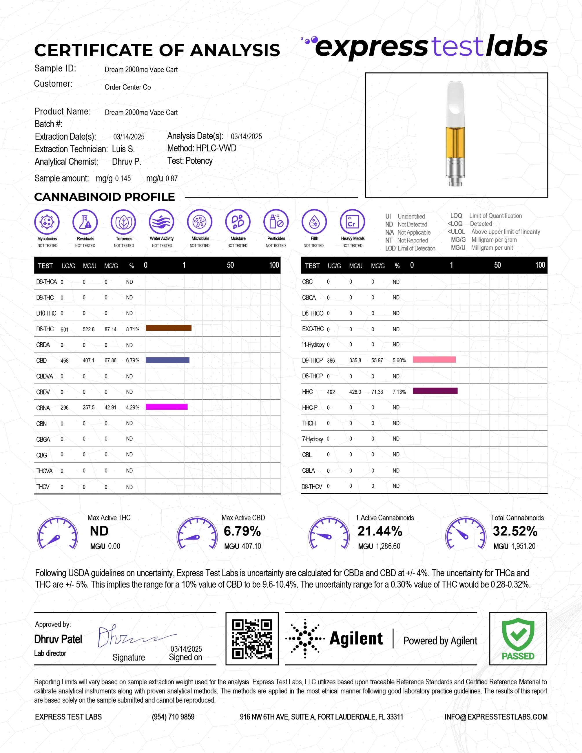 - Terpenes: Myrcene, Linalool, Humulene, Pinene