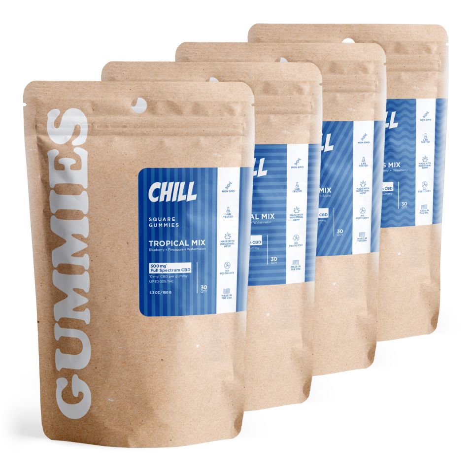 - 10mg Full Spectrum CBD Gummies - Tropical Mix - Chill: A light, sunny starter. Gummy format, Full Spectrum CBD, 10mg per gummy in breezy tropical flavors.