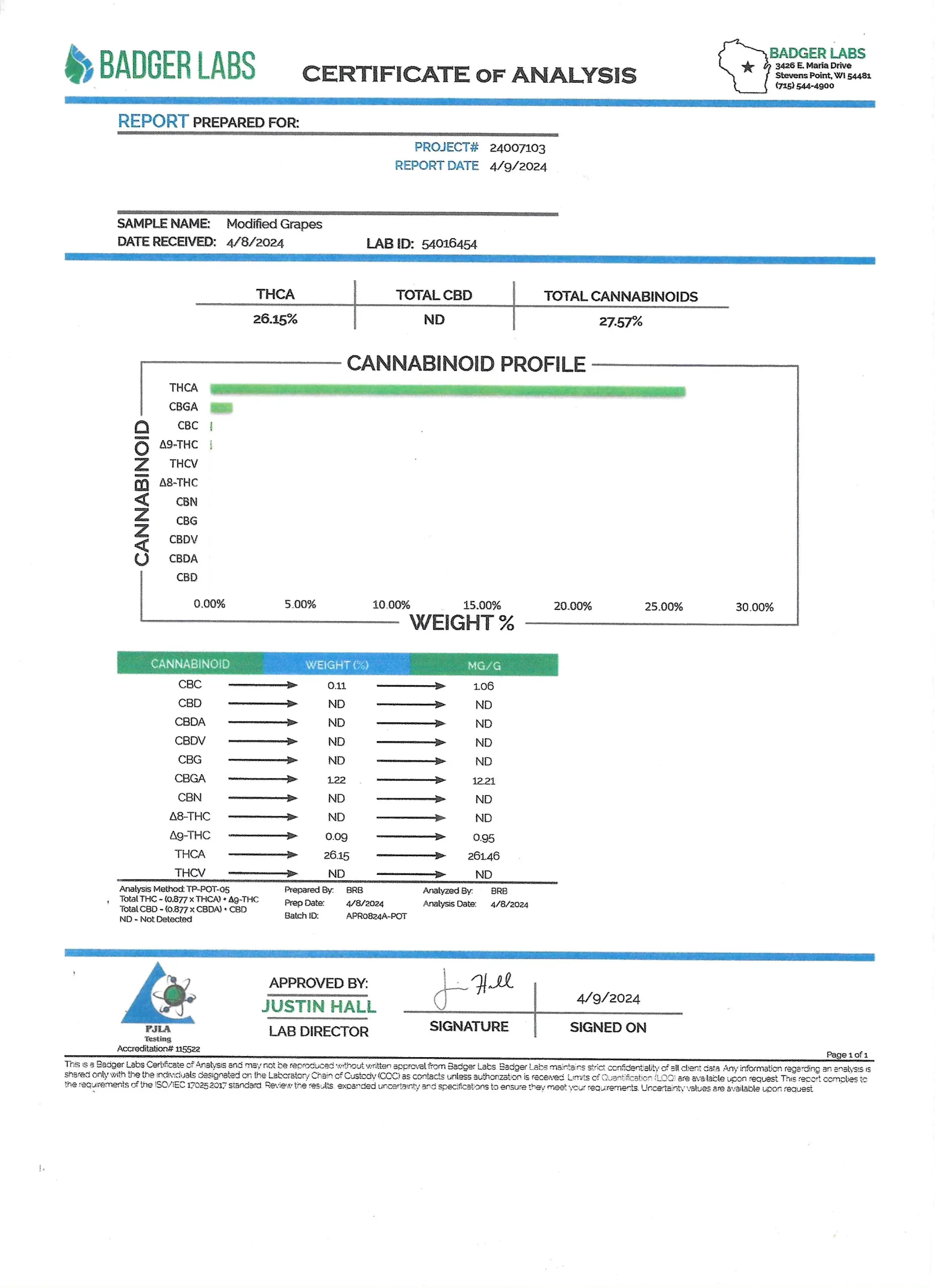 Unwind and indulge with our Modified Grapes Flower—an exquisite hybrid THCA strain designed for relaxation and a touch of sweetness.