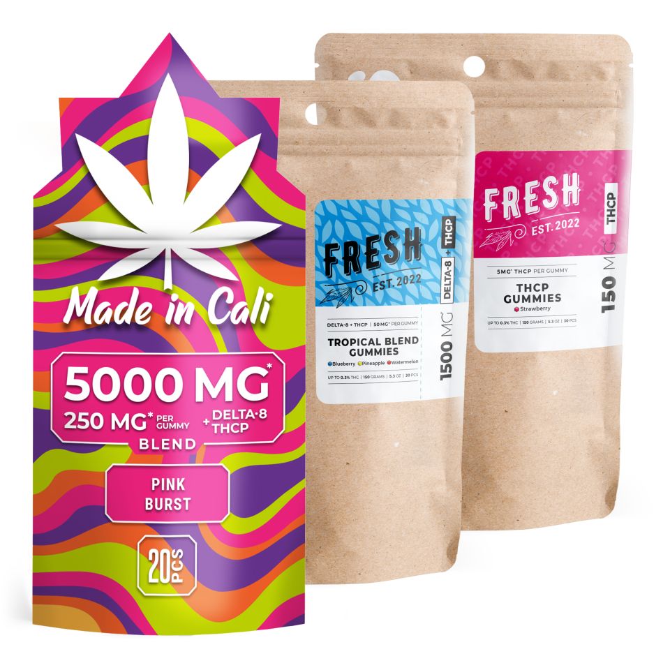 Meet the THCP Gummies Bundle, a curated trio of fruit-forward edibles pairing THCP with Delta 8 in crowd-pleasing flavors like Pink Burst, Tropical, and Strawberry. This set blends mix-and-match effects with convenient gummy formats and brand variety from Fresh and Made In Cali. Expect easy, pre-measured servings, tasty profiles you’ll actually look forward to, and the confidence of shopping with a trusted team that’s served millions—complete convenience and value in one grab-and-go bundle.